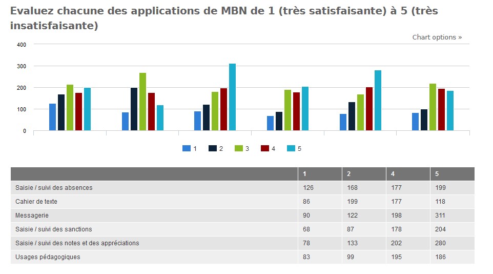 Malgré tout, on constate que la messagerie est l’application qui pose le plus de problème (plus de 50% de notes 4 et 5) devant la saisie et le suivi des notes et des appréciations (environ 40% de 4 et 5) et la saisie et le suivi des sanctions.
