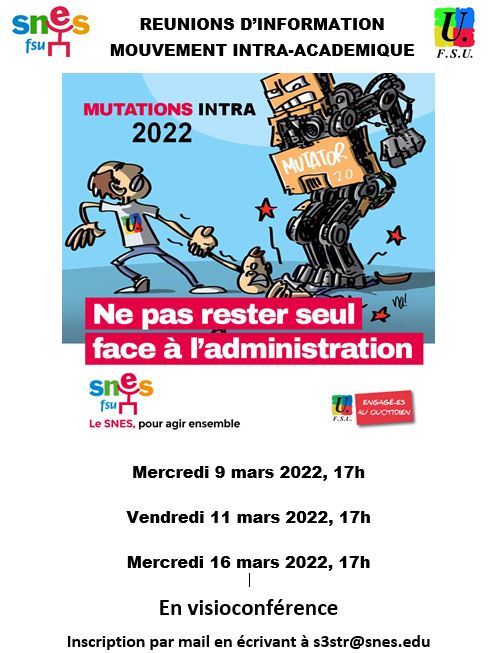 Vous êtes ici : Accueil Mutations et Carrières Mutations Préparer votre mutation intra académique avec le SNES-FSU 18 février 2022 Mutations et Carrières Préparer votre mutation intra académique avec le SNES-FSU Imprimer l'article Possibilité de rendez-vous individuels (réservés en priorité aux adhérents). Nous contacter : 03 88 75 00 82 ou s3str@snes.edu